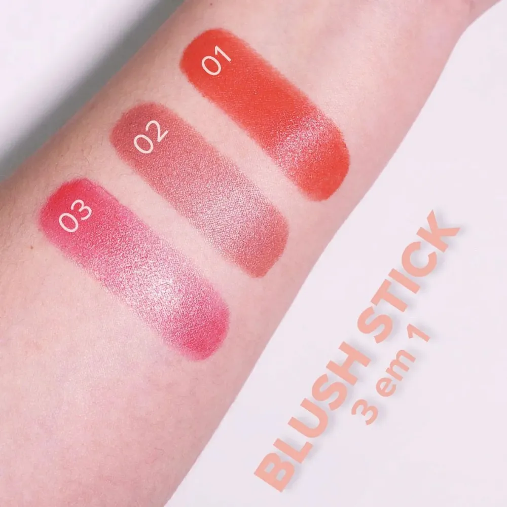Super pigmentado, o Blush Stick 3 em 1 possui uma textura cremosa e confortável e proporciona um efeito de pele saudável e natural com alta durabilidade e sem manchar. Prático para aplicar, o bastão também é multiuso,  pode ser usado nos olhos, boca ou bochechas. O Blush Stick 3 em 1 está disponível em diferentes cores.