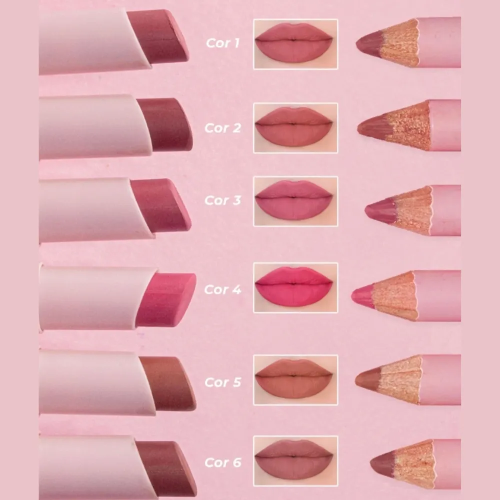 Um lápis labial para fazer aquele contorno, e para colorir os lábios, um lindo batom bala.